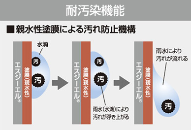 塗膜表層の親水化により大気中の汚染物質の付着を抑制し、雨水によって洗い流すセルフクリーニング機能(雨筋汚染の防止)を備えています。
