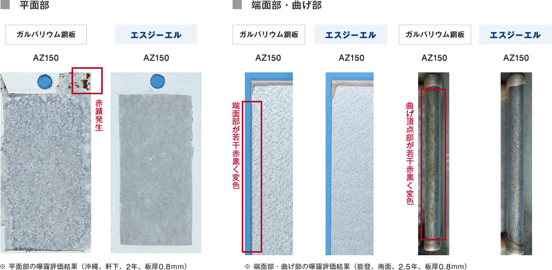 エスジーエルは、ガルバリウム鋼板のめっき構造を引き継ぎつつ、マグネシウム添加により、その特長をさらに引き出すめっき構造を有しています。それにより、亜鉛めっき鋼板に比べてはもちろん、ガルバリウム鋼板と比べてもとくに厳しい腐食環境で強い耐食性を発揮します。