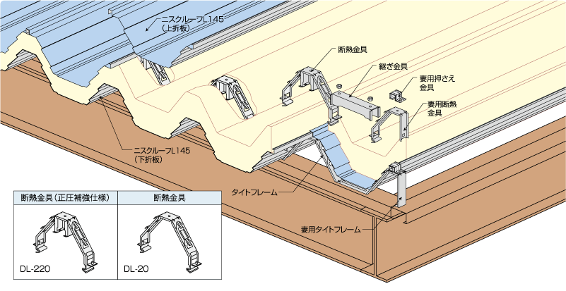 ※断熱金具 DL-20 と断熱金具(正圧補強仕様)DL-220 は、同じ屋根面での併用も可能です。詳しくは弊社までご相談ください。
